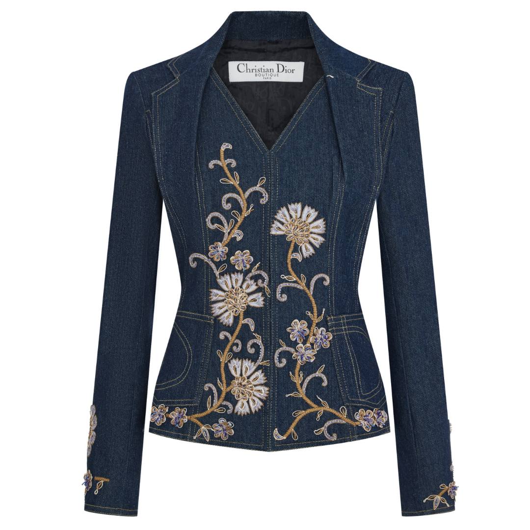 Приталенный, стильный жакет из денима Dior – абсолютный тренд. В этом изделии особенно много интересных деталей: рельефные швы, на спинке – отстрочка в виде сердца, на карманах – отсрочка в виде буквы D, дополнительный декоративный английский воротник. Классический синий деним в сочетании с роскошной объёмной цветочной вышивкой 3D. Чёрный подклад с логотипами модного дома. Жакет прекрасно сочетается с денимом, брюками, юбками и платьями.