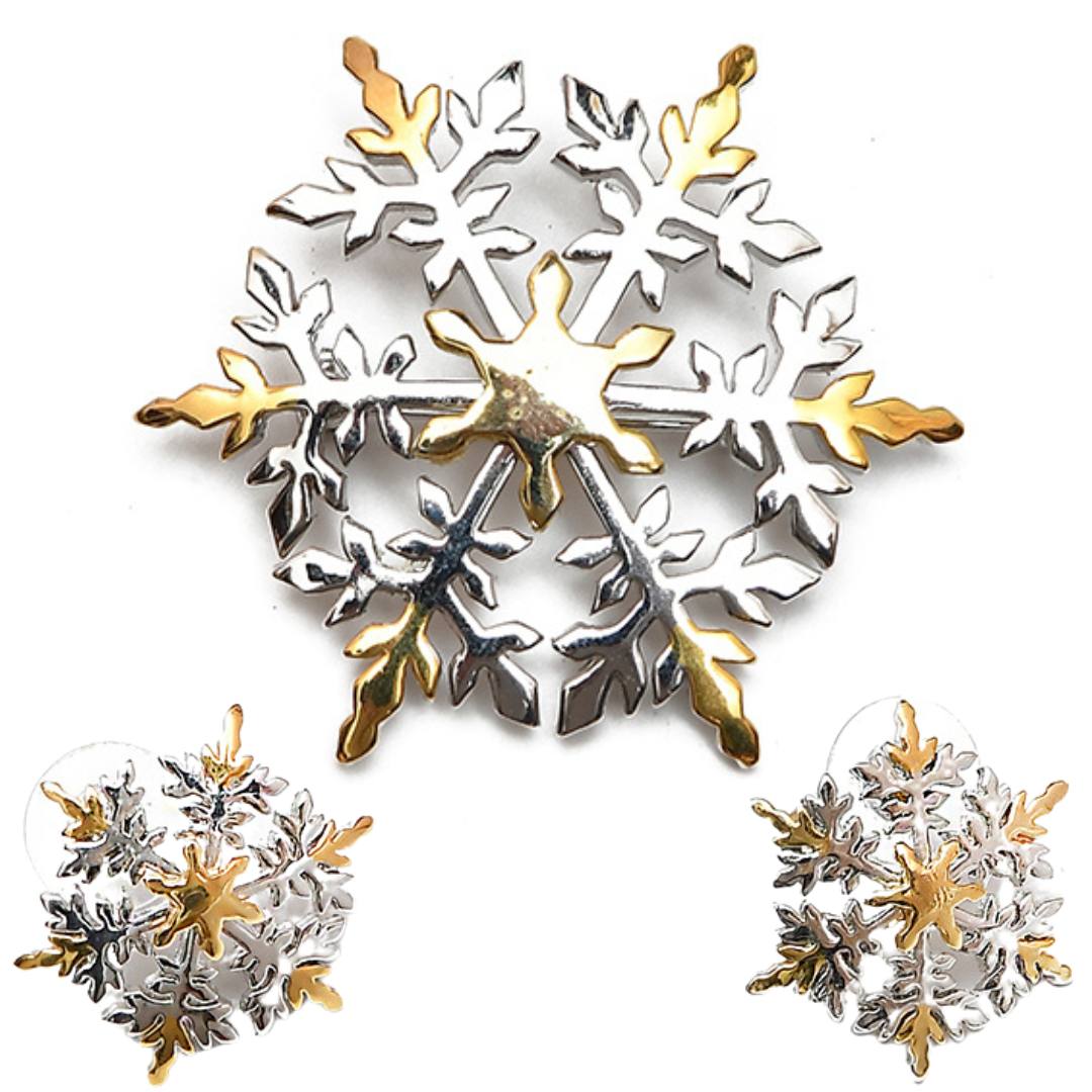 Праздничный и новогодний винтажный комплект, состоящий из броши и серёжек. Украшения сделаны в виде снежинок. Лаконичный, стильный и актуальный сет станет отличным подарком на Новый год. Этот комплект идеально подрйдёт к любому образу, привлечёт внимание и подарит новогоднее настроение. Серьги и брошь выполнены из металла цвета золота и серебра. Биколорные украшения (совмещающие в себе несколько оттенков металла) – абсолютный must-have!