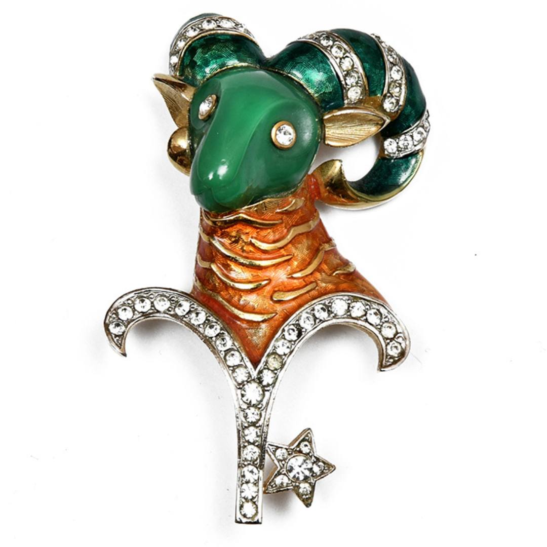 Украшения в виде знаков зодиака присутствуют в коллекциях почти всех знаменитых бижутерных брендов, но самыми выдающимися с точки зрения дизайна по праву считаются знаки зодиака от De Nicola. Именно эти знаки зодиака считаются не только самыми красивыми, но и обладающими наибольшей коллекционной ценностью. Зачастую такие броши приобретают не только по принципу мой знак, но и просто для коллекции. Особенно ценной считается полная коллекция из всех 12 знаков зодиака. Перед Вами брошь с изображением овна. Изделие выполнено из металла золотого цвета и украшено изумрудной эмалью и белыми кристаллами. Эффектное и стильное украшение!