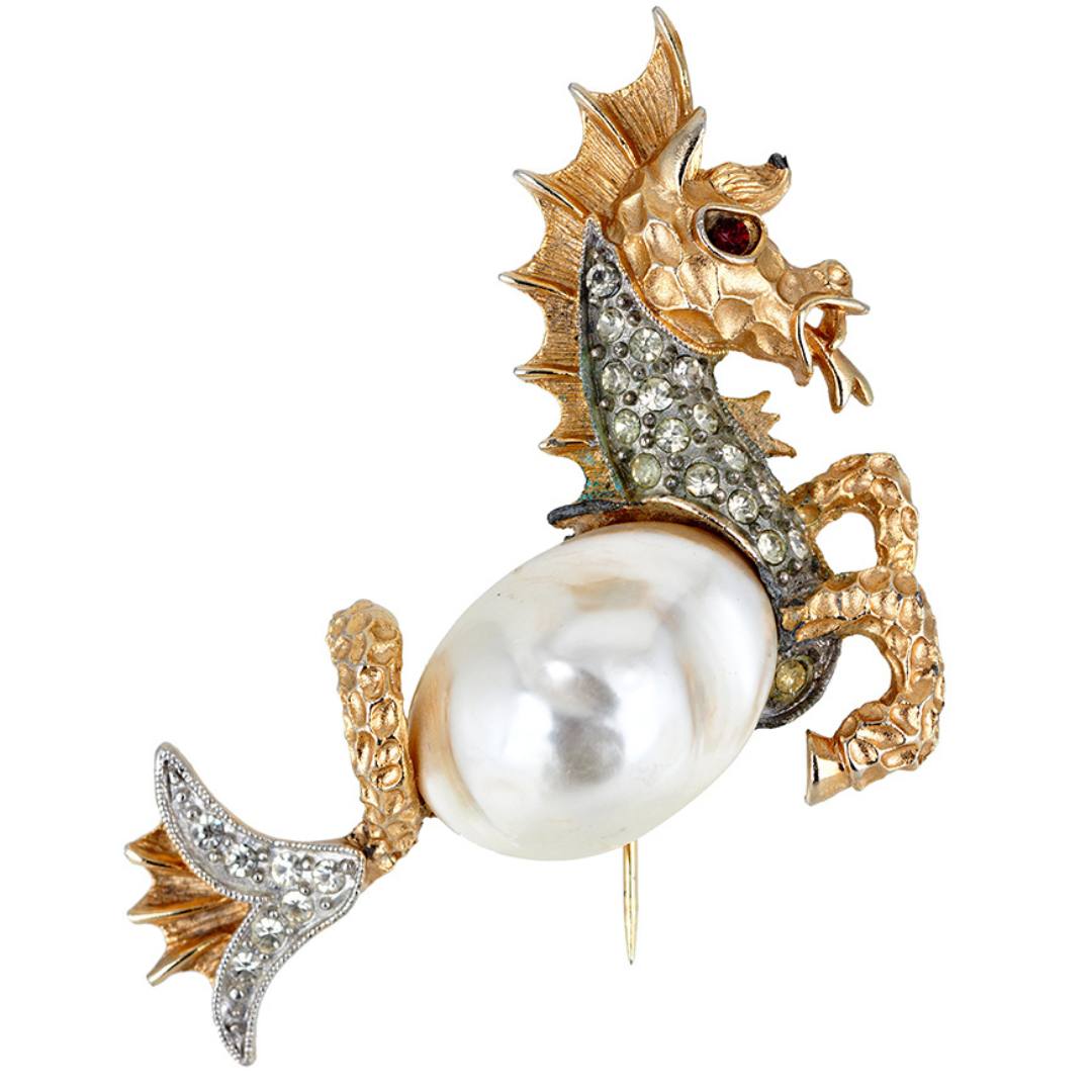 Очаровательная брошь в виде морского дракона. Эта милая брошь в виде дракона с плавником переносит в сказку! В украшении сочетаются металл серебряного и золотого цвета, что особенно актуально в этом сезоне. Тренд на биколорные украшения прочно и надолго закрепился и не собирается сдавать позиции. Украшение дополнено крупной барочной жемчужиной — пузико дракона и белыми кристаллами, украшающими хвостик и тельце. Фактурный металл классического золотого цвета дополняют брошь, делая её еще оригинальнее.