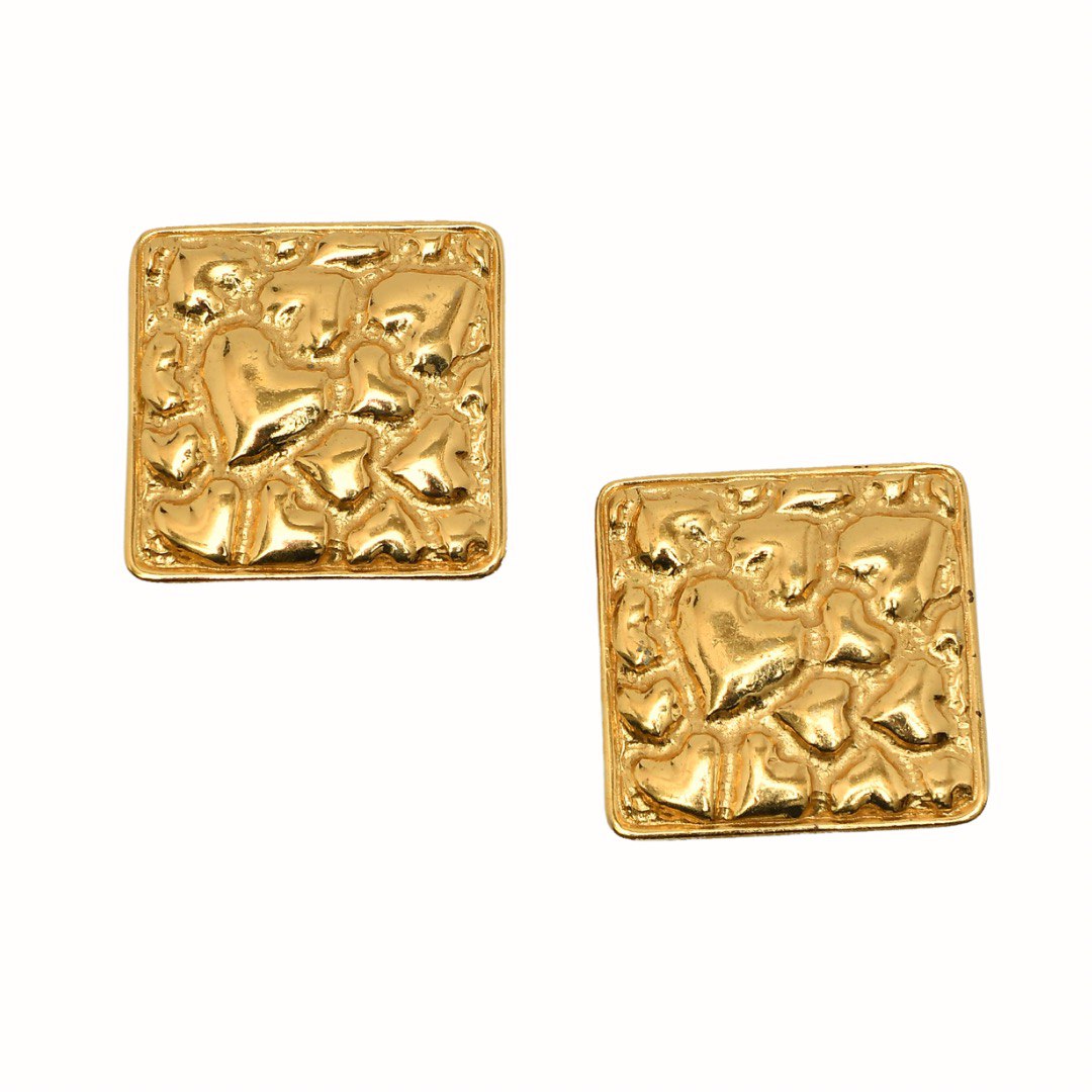 Клипсы выполнены в форме прямоугольного листа из фактурного металла золотого цвета. Они усыпаны объёмными, «выпуклыми» сердцами разных размеров по всей площади клипсов. Украшение-заявление о любви к миру, себе и моде.