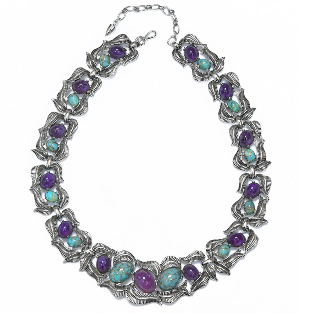 Великолепное колье Boucher 1954 г. с кабошонами цвета аметиста и бирюзы. Колье выполнено из металла серебряного цвета в виде листьев. Овальные кабошоны как будто утоплены в объемной оправе в виде серебряных листьев.Ожерелье имеет регулируемую застежку. Потрясающее украшение, которое дополнит любой образ, сделав его оригинальным, женственным и неповторимым.