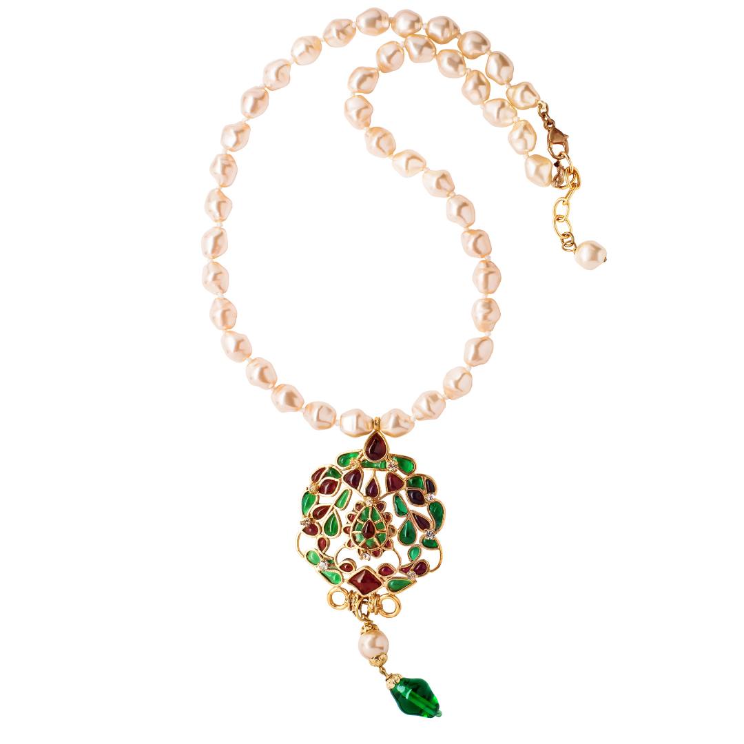 Стильное колье от французского модного дома Chanel. На нитке кремового барочного жемчуга — подвижный подвес из стекла Грипуа с кристаллами. Очаровательное колье в стиле ренессанс смотрится стильно и невероятно красиво. Оно дополнит вечернее платье, однотонную футболку или объемный свитер.