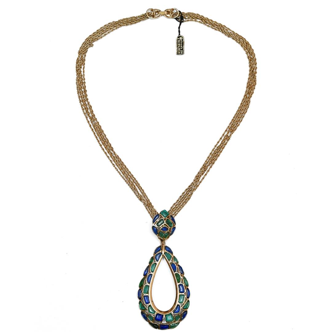 Это уникальное, редкое и коллекционное украшение. Акцентное каплевидное колье на двойной цепи золотого цвета. Центральная часть дополнена стеклянными кабошонами цвета изумруда и сапфира. Это украшение особенно играет при попадании лучей. Оттенки сливаются, создавая непередаваемую игру цвета. Колье состоит из основной части и крупного подвеса каплевидной формы с полой серединой. Изумительное украшение, которое станет жемчужиной любой коллекции.