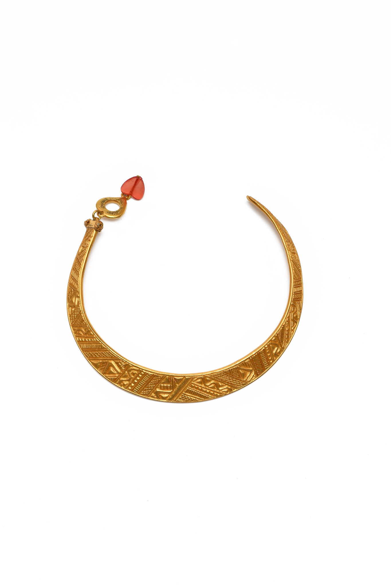 Необычный жёсткий чокер из фактурного металла золотого цвета с подвесом в виде сердца. Одновременно элегантный и роскошный, стильный и необычный. Он один способен превратить дневное платье в коктейльное и повысить настроение до нужного градуса! Этнические мотивы видны по «узору» металла. Один из концов дополнен подвесом-сердцем из кристалла, прикреплённом к металлическому сердцу. На подвесе есть небольшой скол (учтён в цене).
