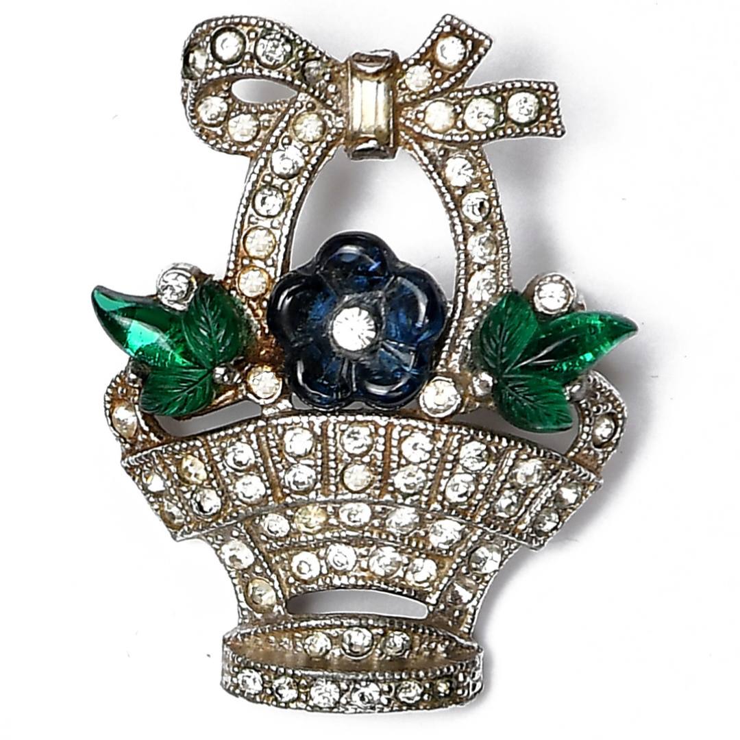 Очень нежная брошь в виде корзины с цветами из серии «Tutti Frutti» или «Фруктовый салат». Предположительно раннее изделие от Trifari. Классическое и элегантное сочетание синего и зеленого цветов.