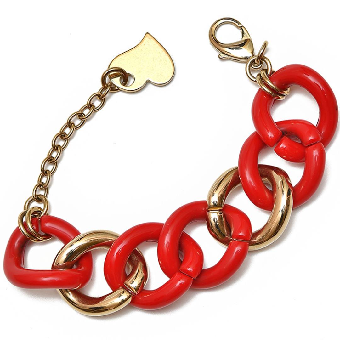 Массивный браслет с крупными звеньями в виде цепи. Изделие состоит из металлических и пластиковых звеньев яркого красного цвета. Украшен металлическим подвесом в виде сердца. Крупная застёжка карабин — не только надёжно фиксирует изделие, но и является декоративным элементом.